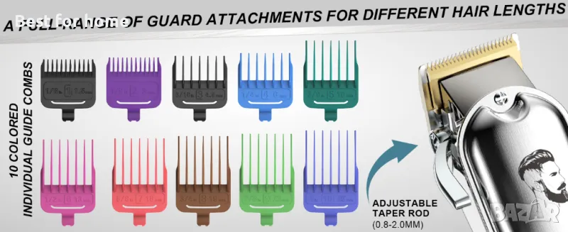 Регулируем конусен лост и десет цветни направляващи гребена: Лесно променяйте плътността на подстригването между дължините на водещия гребен, преместете лоста нагоре за най-близкото подстригване и го преместете надолу за по-дълго подстригване (От 0,8 mm до 2,0 mm). Предлагат се различни прически и дължини (1,5,3,4,5,6,10,13,16,19,22,25 mm), така че можете да персонализирате всяка прическа, която искате
