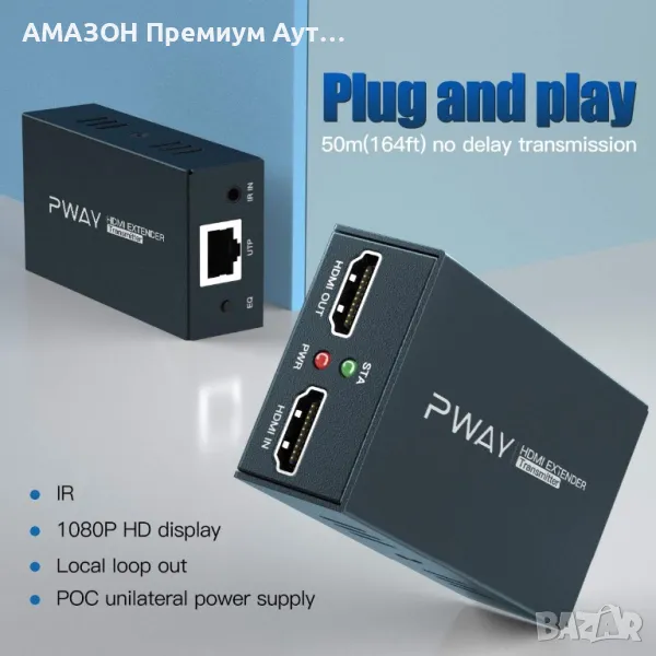 PWAY HDMI удължител 60м с IR/POC функция през Cat5e/6/7 1080P@60Hz,Full HD/3D,Loop Out,EDID