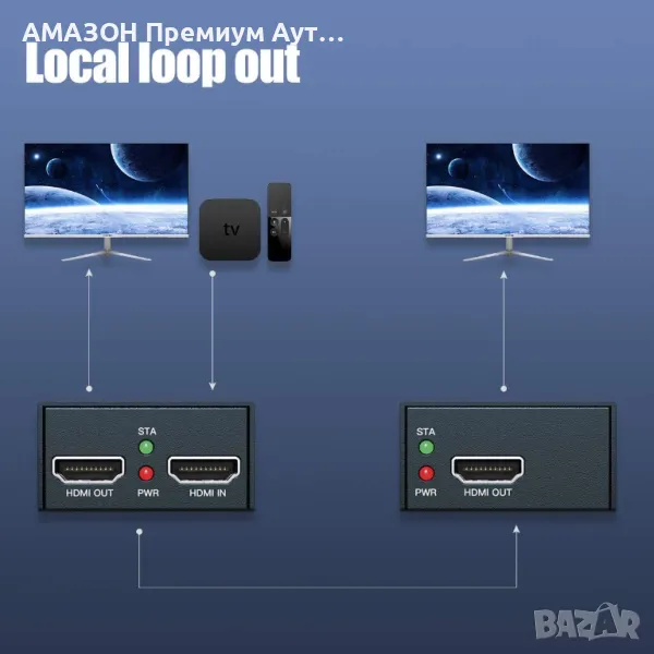 - Функция за IR и Loopout: Контролирайте източника на сигнал дистанционно с еднопосочната инфрачервена функция (20-60KHz). Предавателят включва HDMI локален изходен порт, който ви позволява да прегледате ефекта на HDMI сигнала върху свързан монитор.