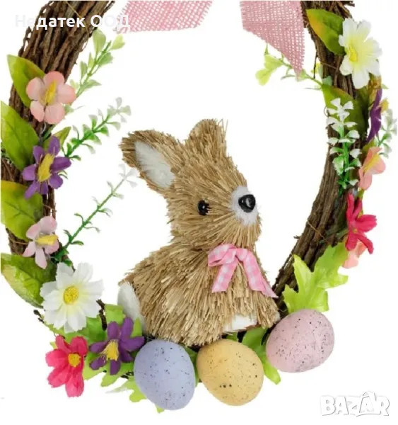 Великденски венец с висулка, украсен с цветни яйца с черни детайли, зеленина с цветя, зайче в бяло с розова карирана панделка на врата и розова панделка от чул в горната част.