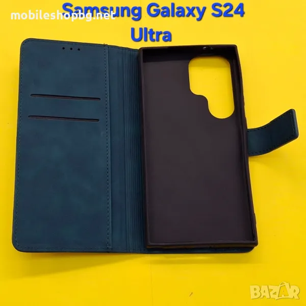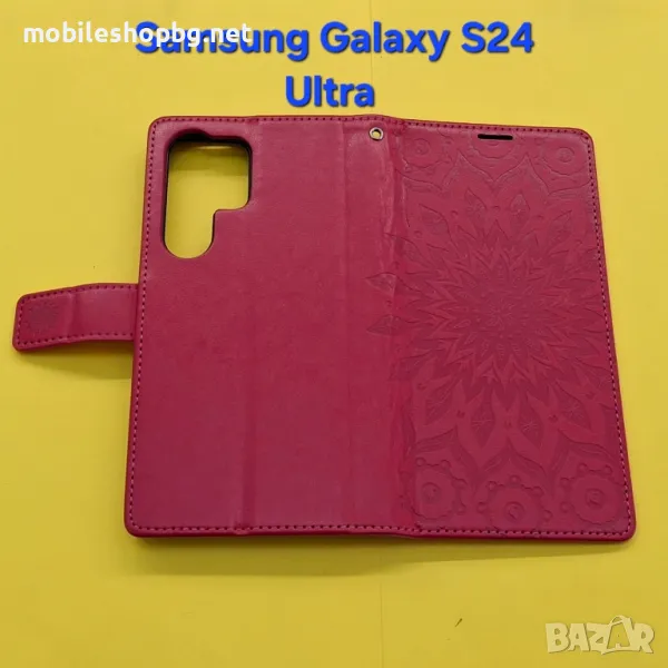 Калъф за Samsung Galaxy S24 Ultra страничен с прегради и закопчаване розов маджента и маслено зелен. Цената е за един брой.