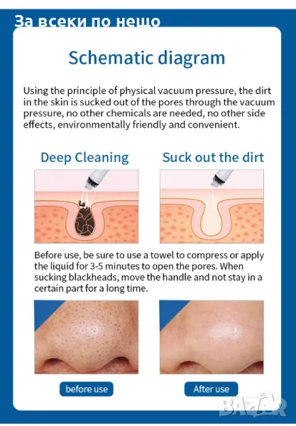 Дермабразионен писец: Почиства кожата, премахва мръсотия и черни точки. Температурен диапазон: 25°C до 70°C. Разполага с 9 различни накрайника.