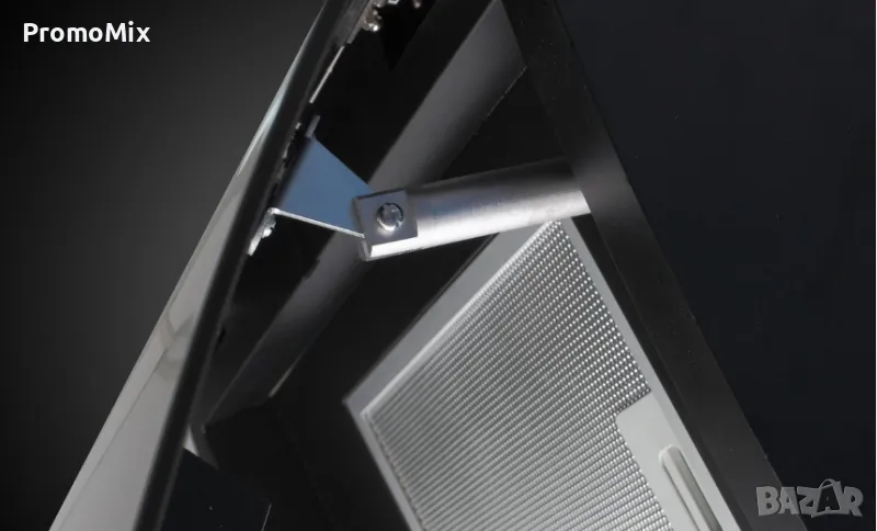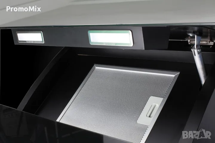 Аспираторът е изработен с широчина 90 сантиметра, а при включване на уреда автоматично се отваря напред, като ефективно отстранява миризми по време на готвене.
