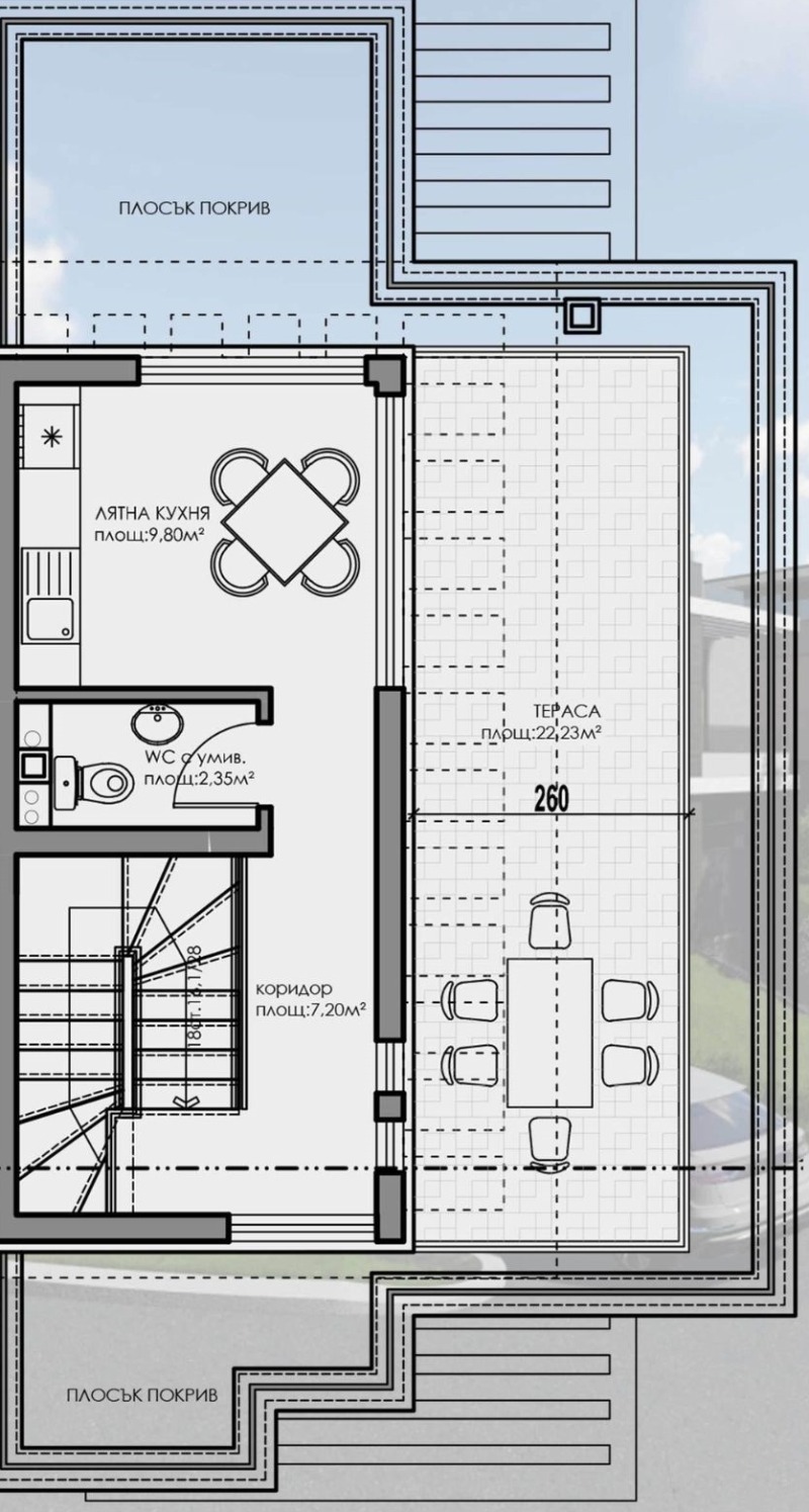 Проектът включва девет двуфамилни къщи, всяка разположена на отделен парцел с обща площ от 7 дка. Всяка къща е разделена на две идентични части с РЗП от 338 кв.м. и прилежащи дворове с площ от 250 до 350 кв.м. В момента предлагаме за продажба къща 9Б, която е с РЗП от 338 кв.м. и 250 кв.м. собствен двор перфектното решение за тези, които търсят комфорт и пространство.