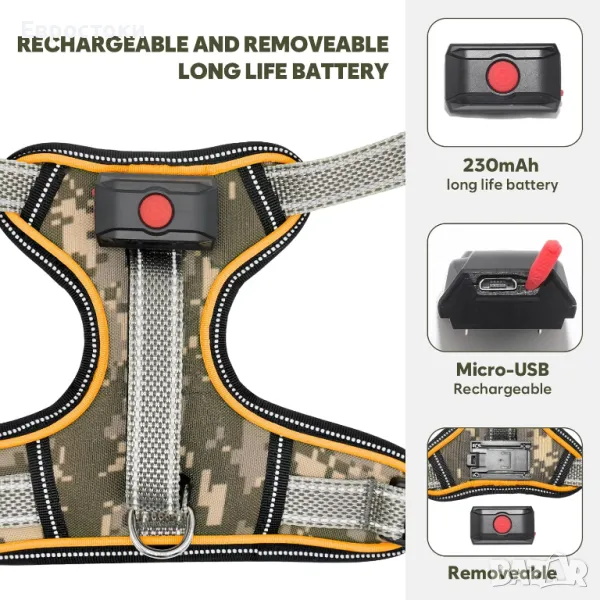 Предлага се с батерия с дълъг живот от 230 mAh, 1,8-2 часа до пълно зареждане и издържа >9 часа при постоянна светлина), >15 часа при бързо мигане. Междувременно този LED нагръдник за кучета има 4 лесни за регулиране ленти, които можете да използвате, за да създадете идеална форма за вашето куче. Не забравяйте да оставите място около два пръста за вашето куче.