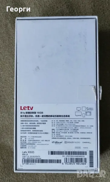смартфон LeTV модел Le 1s 5.5 инча 1080x1920, RAM 3 GB, storage 16 GB, батерия 3000 mAh, камера 4160х3120 пиксела, тегло 169 гр; запазен и напълно функционален с нормални следи от употреба, налична кутия