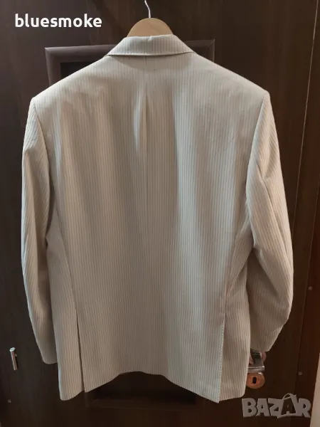 Обличан е само веднъж за събитие, сватба. Размер 48, има го на снимките. Ризата е М размер, може би още веднъж е обличана тя.