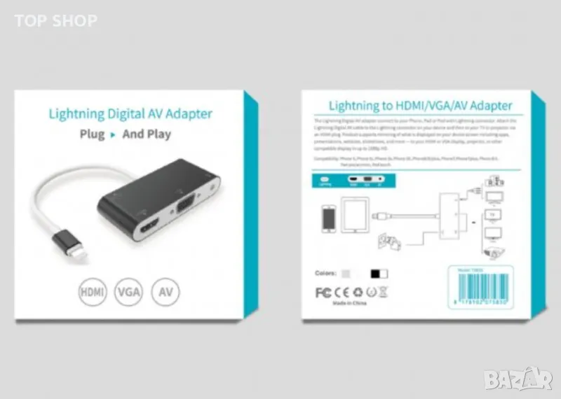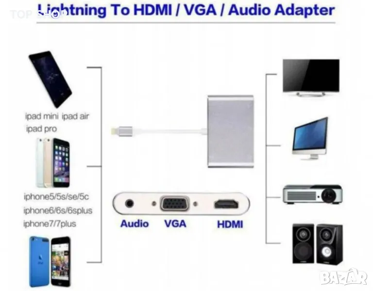 Свържете HDMI или VGA порта към съответния интерфейс на телевизор, проектор, монитор, той ще поддържа както аудио, така и видео изход едновременно. ВАЖНО: Също така поддържайте HDMI и VGA дисплей едновременно, по-добре от повечето други Lightning 8-пинови HDMI / VGA изходи заедно с адаптери.