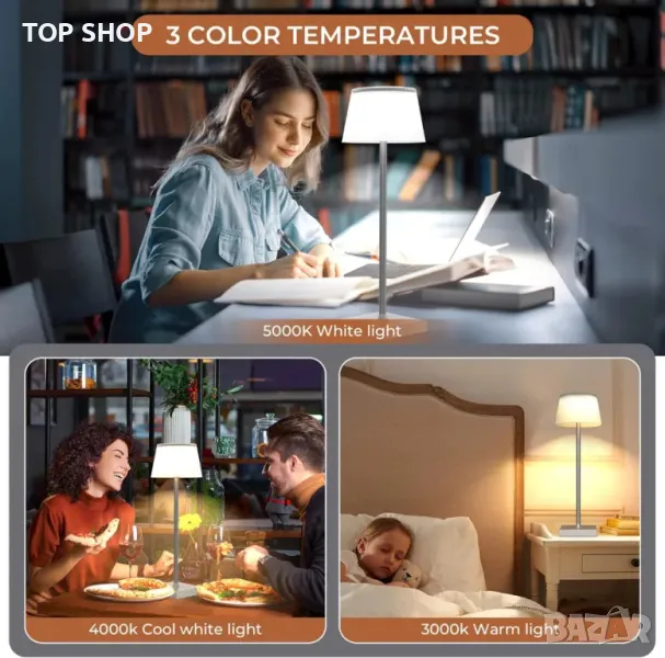 Лесен за използване: леко докоснете превключвателя на настолната лампа, за да изберете желания цвят от 3 вида светлина (3000K/4000K/5000K), натиснете продължително сензорния превключвател, за да регулирате яркостта на плота на масата (5%~100%)