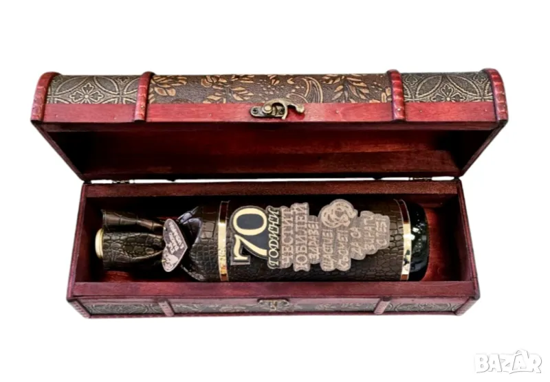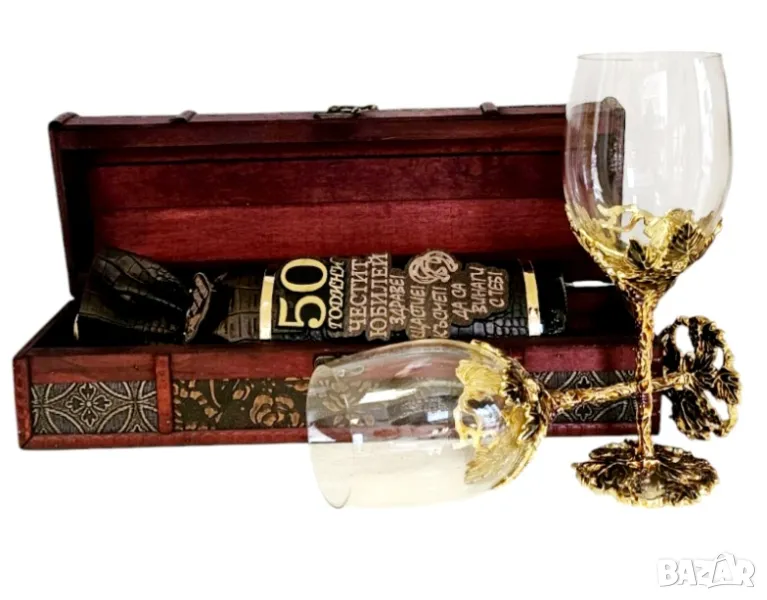 Бутиков комплект от 2 чаши за вино в дървена, ретро кутия с бутилка декорирана с кожа във формата на торбичка, дървена плочка с пожелание и златни цифри съобразно повода. .