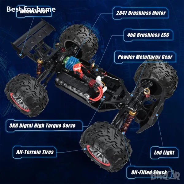 【Автентично изживяване при шофиране】Изпитайте вълнуваща скорост с нашия безчетков високоскоростен Monster Truck! Този мощен радиоуправляем камион за възрастни разполага с безчетков мотор 2852 3100KV с метален радиатор за светкавично бързо действие. RC cars fast идва с 45A ESC и охлаждащ вентилатор за ненадмината скорост и производителност! Съвместим с 2S батерии и поддържа до 3S 11.1V батерии (7.4V-11.1V батерии).