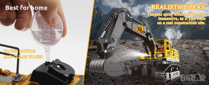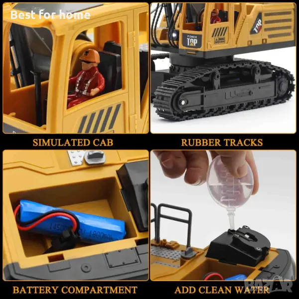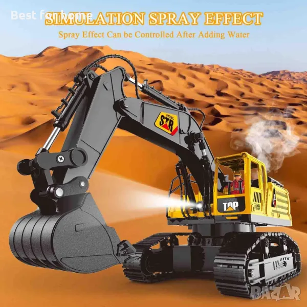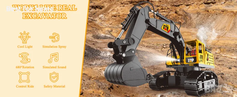 【Детайлна и реалистична】 Тази впечатляваща играчка копира истински багер. Двойните гумени вериги се справят с всякакви терени. Независимо дали пътувате през пясък, бетон, камъни или някъде между тях, тази играчка RC багер може да копае и да се движи с лекота. Лопатата от метална сплав осигурява мощна сила на копаене, а каретата може да се върти на 680 градуса, за да копае във всяка посока!