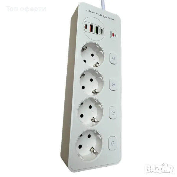 Удължител Jurnjujube, защита от пренапрежение, 4 гнезда, 2 USB, 2 Type-C, 3250W, бял, 2 м