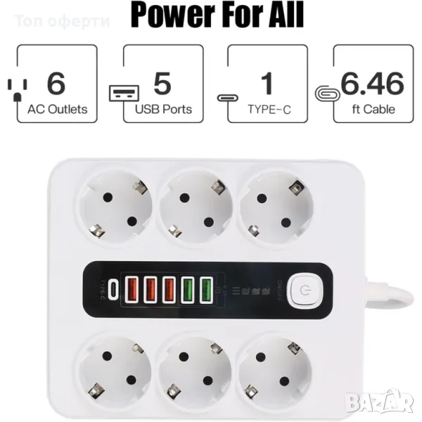 6-пинов разпределител, 5 бр. USB, 1 бр. с конектор C, 220V, 3000W, 10A, бял: