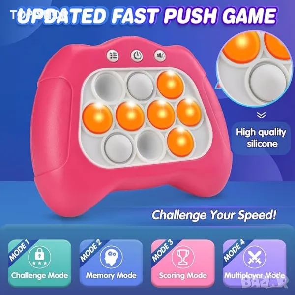 Пристрастяващата актуализирана игра с бързи балончета, която е по-забавна и издръжлива. Помага на децата да подобрят уменията си за памет и координацията око-ръка, насърчава сетивното им развитие и намалява времето им пред екрана по забавен начин. Подобреният качествен силикон е по-издръжлив и носи непрекъснато щастие на децата.