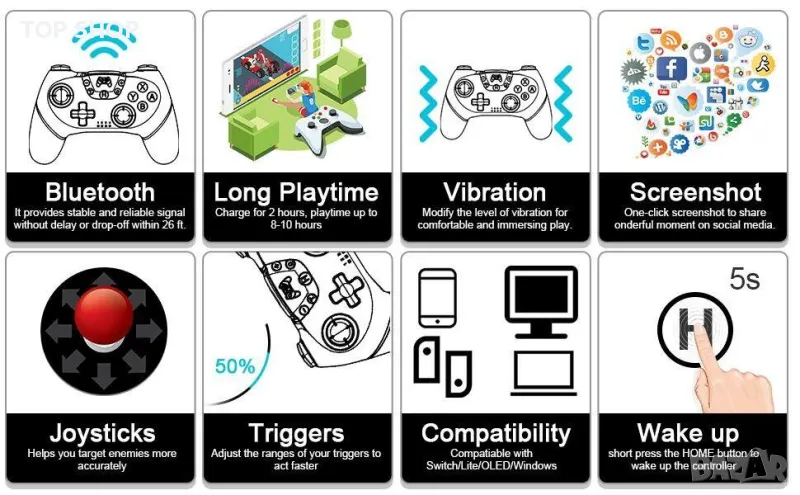 ?【МОЩНА ФУНКЦИЯ】? НАШИЯТ контролер поддържа функцията на жироскопа и функцията за вибрация на двойния двигател. Вибрационната обратна връзка ви дава завладяващо игрово изживяване. Супер чувствителното разпознаване на бутоните осигурява точно игрово изживяване. Двойните аналогови стикове и тригерите за разширяване осигуряват прецизен контрол на движението. Без NFC и функция за събуждане.