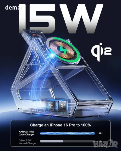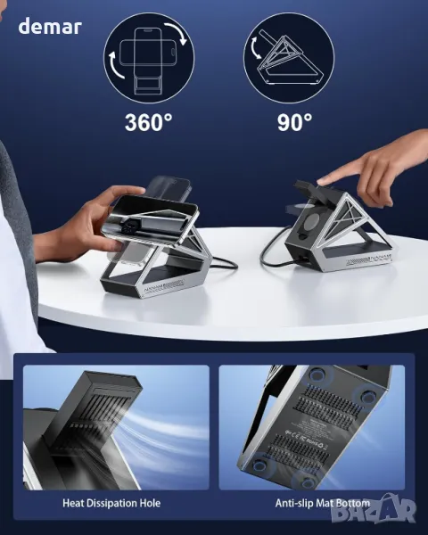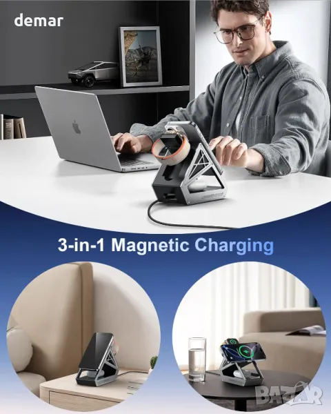 Тази сертифицирана по Qi2 станция за бързо безжично зареждане 3 в 1 предлага 15 W зареждане за iPhones, 5 W за Apple Watches и поддръжка за AirPods, осигурявайки ефективно, едновременно зареждане. Със съвместимост с MagSafe, 1000g магнитна сила на задържане и въртящ се на 360° дизайн, той осигурява сигурно и прецизно подравняване. Изработен от авиационна алуминиева сплав и неръждаема стомана, той е издръжлив, топлинно ефективен и компактен, включващ мек светодиод за нощна употреба. Пакетът включва 30W USB-C зарядно устройство и кабел, добавяйки гъвкавост за други устройства. Интелигентната защита предпазва от прегряване, презареждане и проблеми с напрежението, което го прави стилно, безопасно и функционално допълнение към всяко бюро или нощно шкафче.