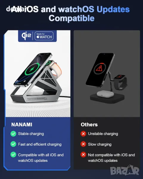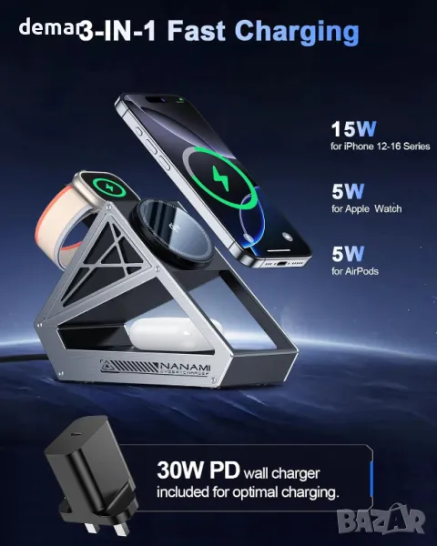 NANAMI Безжично зарядно устройство 3 в 1 за iPhone, iWatch, AirPods