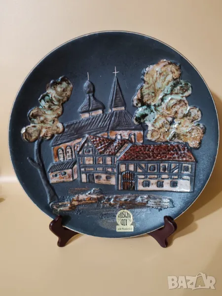 Красиво декорирана с изразен релеф и изглед към село, дървета и красива църква.