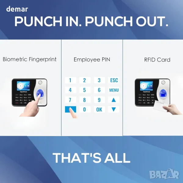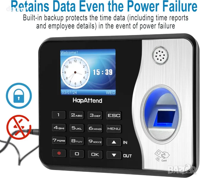 Бърз за настройка с насоки стъпка по стъпка от YouTube, този самостоятелен часовник гарантира поверителност на данните, като избягва интернет връзките и използва USB за прехвърляне на данни. Той автоматизира и изчислява точно работните часове, като елиминира ръчните усилия, хартиените карти и мастилените ленти. Без месечни такси, без инсталация на софтуер и проста функционалност извън кутията, той е идеален за малки и средни предприятия с до 1000 служители на различни работни места.