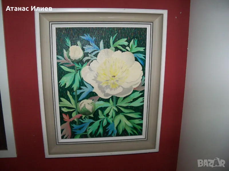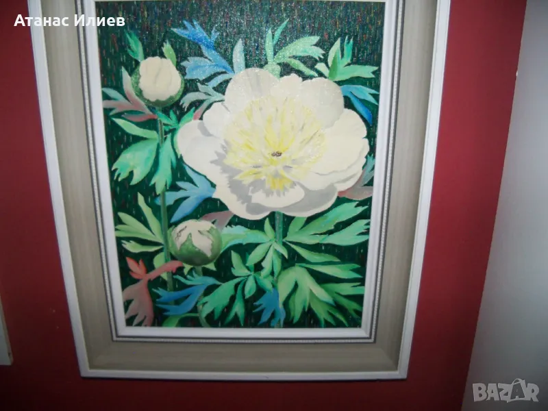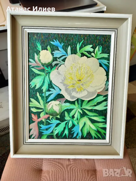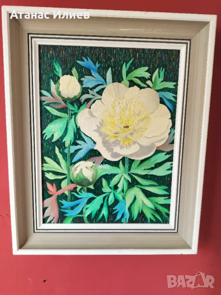 Много красива маслена картина Божур. Размери с рамката 43х35 см. Има подпис в долния десен ъгъл ГМ, но не знам кой е автора. Картината е в отлично състояние с леки забележки по рамката.