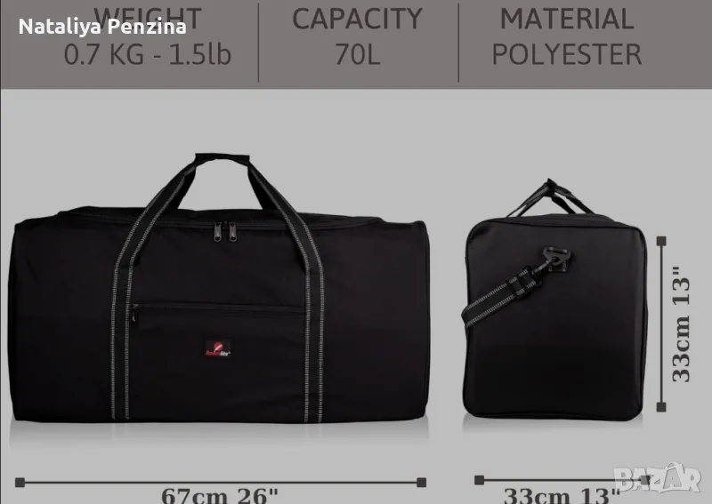 ОГРОМНО правоъгълно пространство с цип и преден джоб с цип за вашия телефон, паспорти, документи за пътуване, портфейл или чанта. Тези спортни чанти са с дължина 76 см и са идеални като регистриран багаж за полет или като чанта за спортно оборудване МАРКА ROAMLITE - ПРОСТРАНСТВО БЕЗ ИЗЛИШНО ТЕГЛО - Тези супер леки сакове са идеални за 1 или 2 седмична ваканция или като най-голяма чанта за пътуване през уикенда или нощувка за вашето каране на ски, тежащи само 910 грама 0,9 кг ПРОСТОЕН КАПАЦИТЕТ ОТ 100 ЛИТРА - БЕЗ ГУБЕНО ТЕГЛО - Унисекс за мъже и жени за носене или съхранение на най-голямо количество дрехи. Идеален за съхранение на зимните дрехи в таванското помещение или за използване като втора чанта за сгъване или опаковане за допълнителни празнични покупки. Сгъва се плоско и наполовина за лесно съхранение. УДОБЕН ЗА НОСЕНЕ - Дълга регулируема подвижна презрамка за презрамка за предпазен колан, 2 Vel Cro заедно горни дръжки за носене. РАЗМЕРИ - 76 см X 34 см X 37 см , 0,9 кг, 100 литра ДВОЙНИ ЦИПОВЕ И ШИРОКО ОТВАРЯНЕ - НЯМА ПОВЕЧЕ МУЧЕНИЕТО ЗА ПЪКВАНЕ НА НЕЩА - Отворете чантата на цели 270 градуса с помощта на заключващите се двойни ципове. СЛОЖЕТЕ ВАШИЯ ПАСПОРТ И ПАРМОФЕЙЛ В ПРЕДНИЯ ДЖОБ - Не се бъркайте при настаняване, подгответе и организирайте основните си документи в малкия преден джоб с цип и лесен достъп
