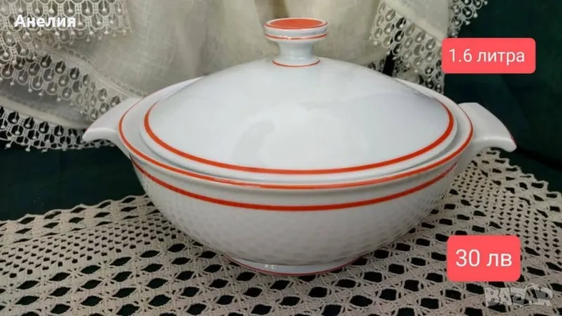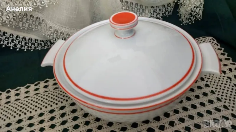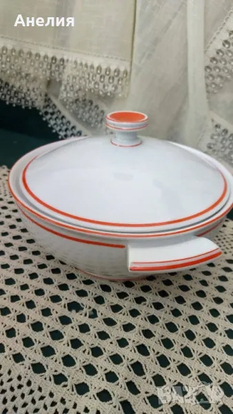 Bavaria Schumann porcelain!Без блясъци злато и сребро.🎀Супници с вместимост 1.6 литра и наситен оранжево/червен кант.Много бели и нежни.Цена х 30 лв.Без забележки!В наличност и 4 чинии за яхнии.Цена 28 лв за 4 те.