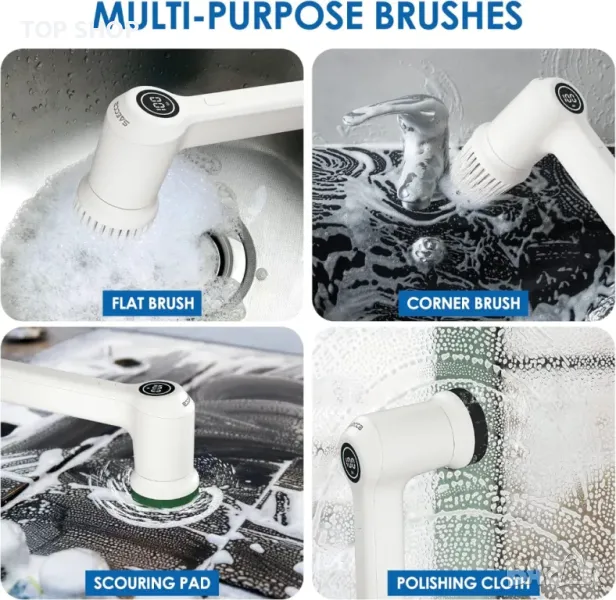РАЗНООБРАЗНИ ГЛАВИ ЗА ЧЕТКИ: SAECCB Electric Spin Scrubber се доставя с 6 взаимозаменяеми глави за почистващи четки, за да сте сигурни, че можете лесно да почиствате различни повърхности. Можете да използвате различна глава на четка за почистване на баня, грил и котлони, силно намаслена стена, под от плочки, фугираща смес, вана, тоалетна, колело на кола, под, стъкло, чинии и др.