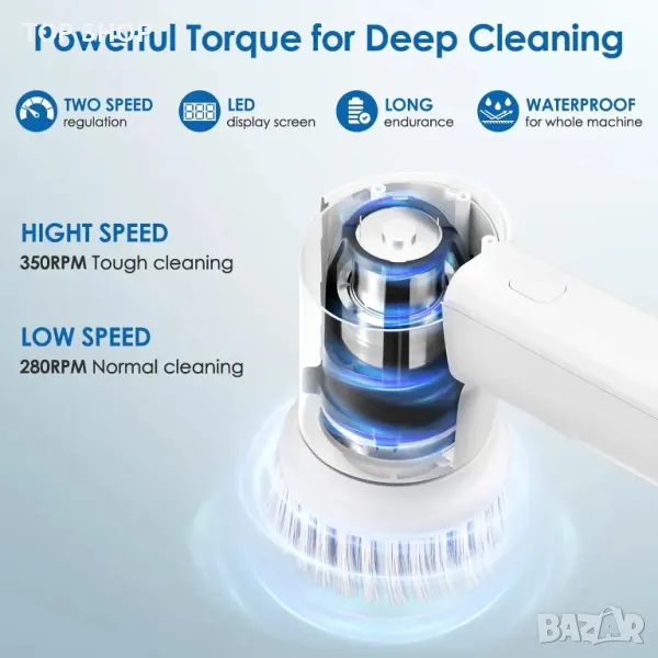 БЪРЗО ЕФЕКТИВНО ПОЧИСТВАНЕ: Двускоростен бутон с един бутон, можете да изберете скоростта на работа. Натиснете веднъж, за да изберете режим на ниска скорост от 280r/min за ежедневно почистване в банята, докато натиснете два пъти, за да изберете режим с висока скорост от 350r/min, идеален за трудно почистване, като петна от кухненска печка. Спестете много време и енергия за ежедневно почистване.
