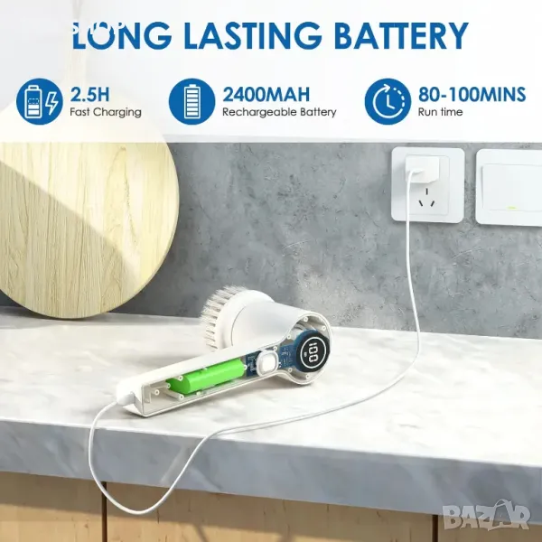 ПРЕЗАРЕЖДАЕМ И ВОДОУСТОЙЧИВ: Вградените акумулаторни батерии позволяват на уреда за почистване на вани да работи непрекъснато в продължение на 80-100 минути с време за зареждане само 2,5 часа. Освен това има водоустойчив рейтинг IPX7, така че работи нормално дори във вода. Можете лесно да използвате тази безжична четка за душ за почистване на всеки ъгъл на къщата.