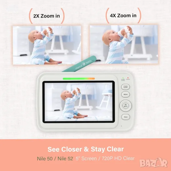 Бебефон с камери и аудио, 5" 720P HD Quad View Split Screen, ниска EMF, камери за нощно виждане Pan-Tilt-Zoom, без WiFi, VOX/гласово активиране, дълъг живот на батерията, Nile 52.