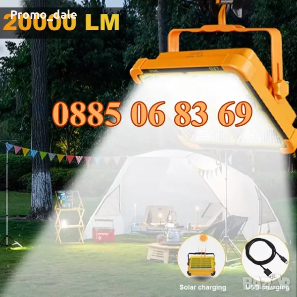 Соларна къмпинг лампа 100W, притежава акумулаторна батерия 16500mAh 10000 LM с безстепенна яркост с режим за аварийна работна светлина за бедствие.