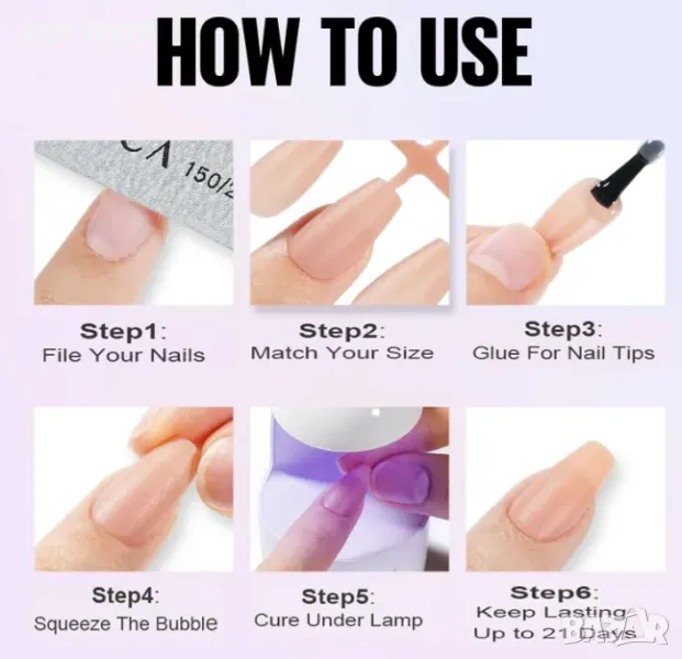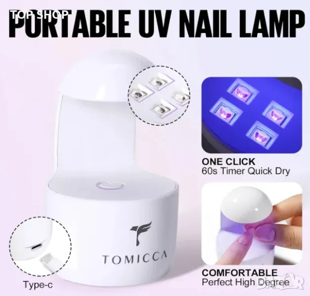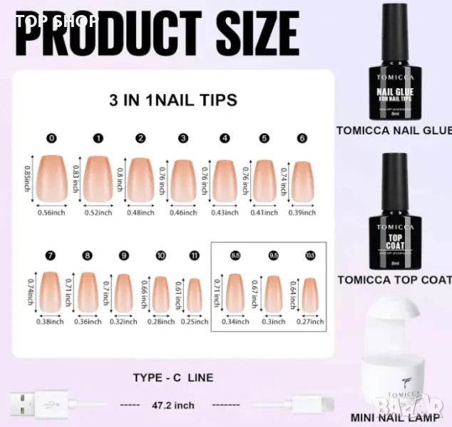 Комплекти за нокти: мини лампа за нокти и пила за нокти. Натиснете превключвателя веднъж, UV светлината ще се включи за 60 секунди. Дръжте нокътя здраво за около 20 секунди по време на втвърдяване, за да не се изплъзне и да няма мехурчета под нокътя. Късите върхове на ноктите TOMICCA са предварително боядисани с розов/телесен цвят. Можете да го стилизирате директно върху ноктите и да се насладите на забавлението от маникюра „направи си сам“!