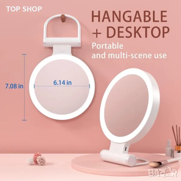 【Универсален и с възможност за окачване + поставяне на маса】 Гъвкав дизайн на сгъваема дръжка. Чрез регулиране на дръжката можете да изберете правилния ъгъл, за да поставите огледалото на всяка равна повърхност, можете също да окачите огледалото на стената или да се използва като ръчно огледало, настолно огледало, висящо огледало.