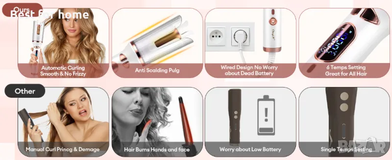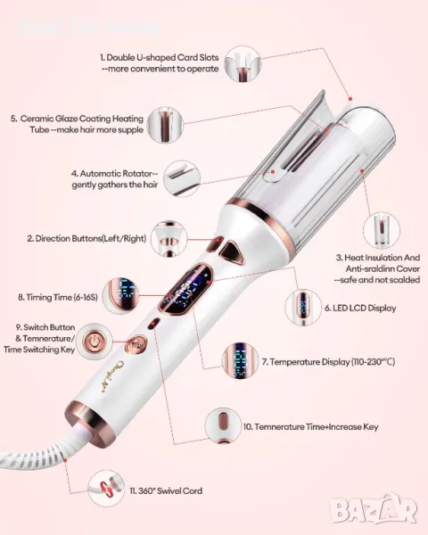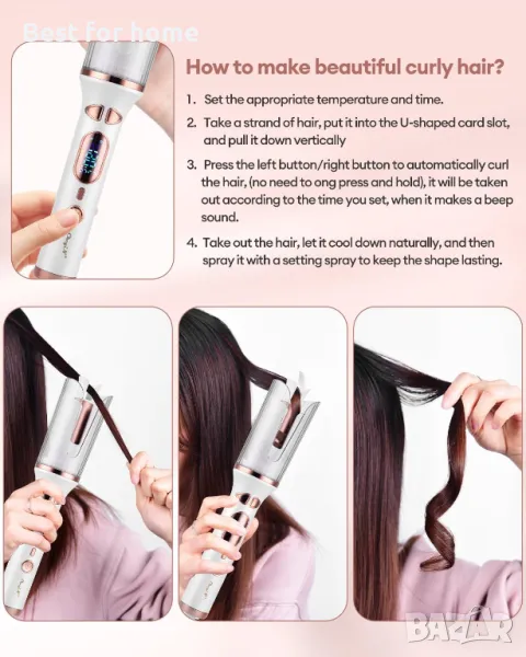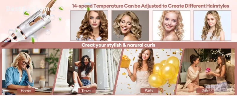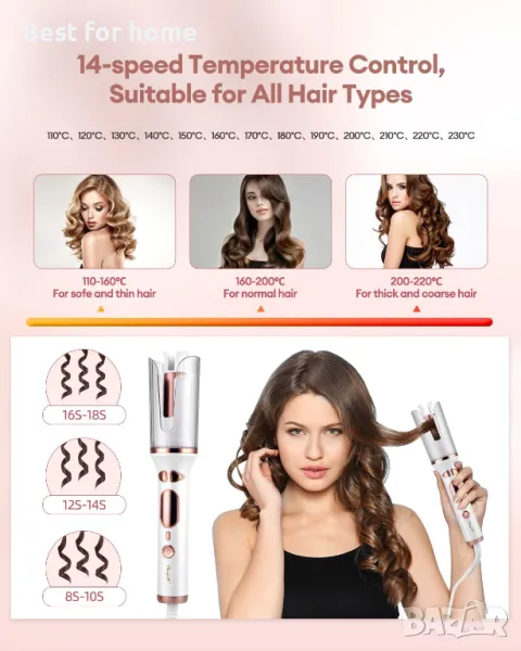 【4 настройки на температурата и 6 таймера】Нашата автоматична маша има 2 посоки на извивката: лява и дясна. 4 температурни настройки от (100°C- 230°C), за да отговарят на различни типове коса. 6s/8s/10s/12s/14s/16s време за автоматично къдрене може да отговори на различни нужди от прическа, като меки вълни, елегантни къдрици, романтични къдрици, класически къдрици.