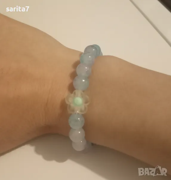 Днес Ви представям едно уникално бижу, а именно моя нов модел синя стъклена гривничка с акцент акрилно цветенце. Гривната е изработена от стъклена мъниста, както се разбира от самото й име и от еластична корда, което я прави универсален размер за всеки, понеже се разтяга. Акцента е малко прозрачно акрилно цветенце със синьо-зелено по средата, което я прави изключително нежна, семпла и симпатична, подходяща както за големи, така и за малки принцеси.
