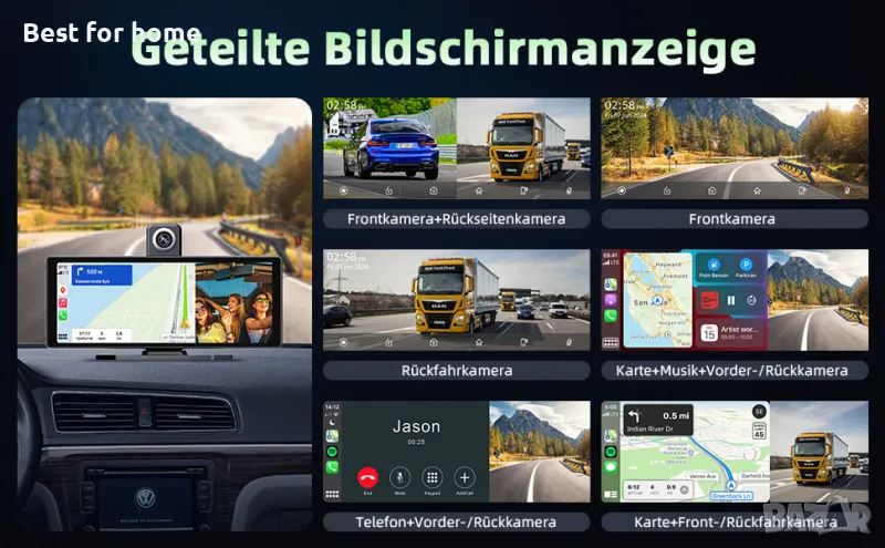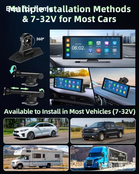 Дисплеят на автомобилното радио carplay се предлага с въртяща се на 360° стойка с вендуза и самозалепващ се държач за фиксиране на конзолата на таблото или предното стъкло и може лесно да се сваля и съхранява.