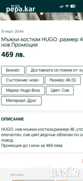 Мъжки костюм HUGO, размер 46. нов Промоция → Обява 48834366