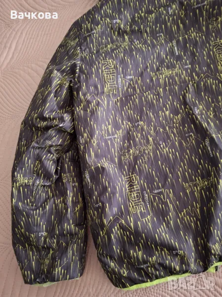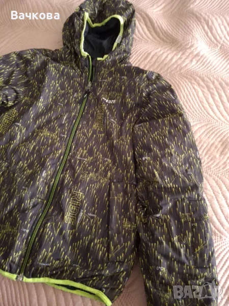 Детско яке с две лица, закупено от Декатлон, размер 133-142 см. Уголемено е и става за по-високо дете (до 152 см.) Якето е добре запазено, само по ръба на ръкавите и отдолу на ластика е леко заваляно.