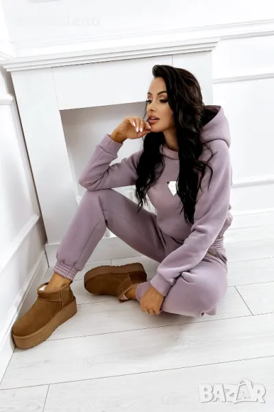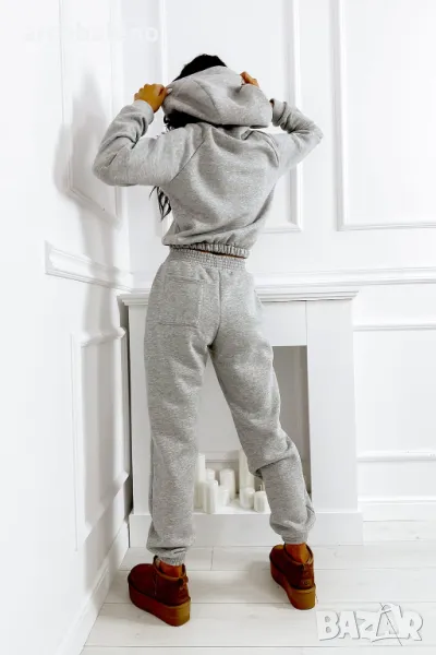 Дебел анцуг, състоящ се от дълъг панталон и удобен суичър с качулка. Суичърът има еластична, ненатискаща лента в долната част. Спортни панталони с висока талия. Можете да ги носите по два начина: висока и ниска талия (както е на снимките).