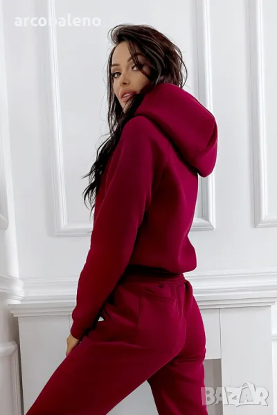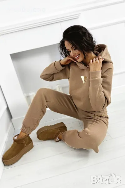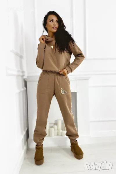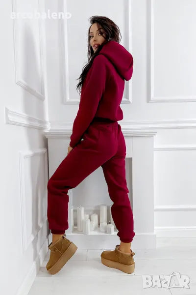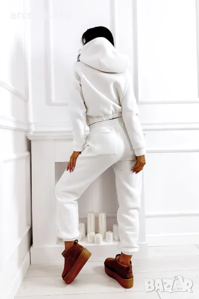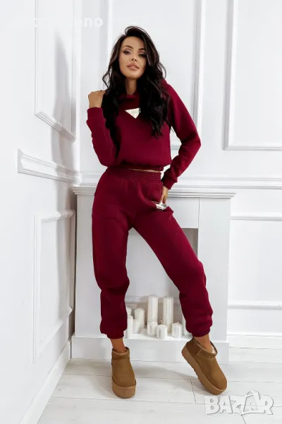 Дебел анцуг, състоящ се от дълъг панталон и удобен суичър с качулка. Суичърът има еластична, ненатискаща лента в долната част. Спортни панталони с висока талия. Можете да ги носите по два начина: висока и ниска талия (както е на снимките).