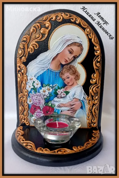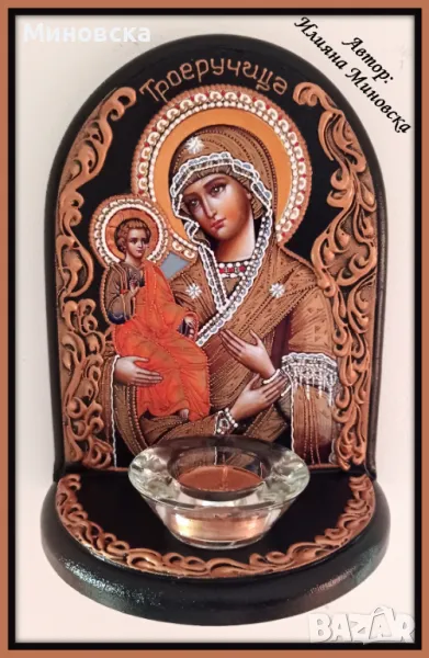 Иконостас, изработен от дърво с размери: 24см х 17см.