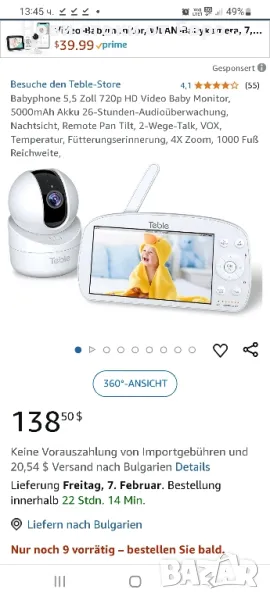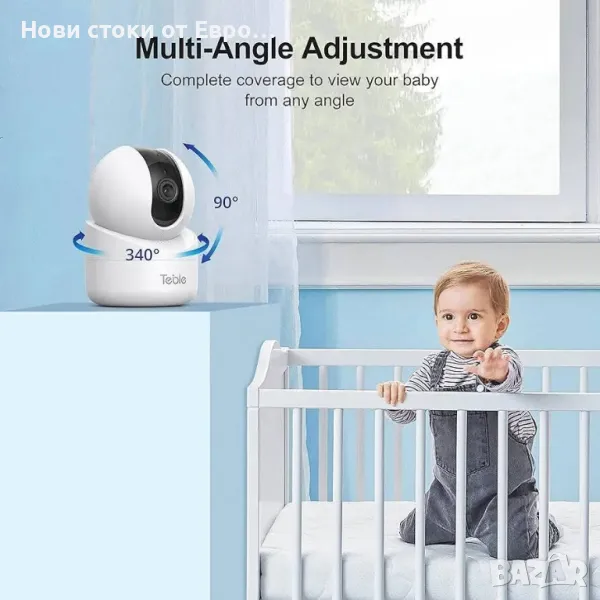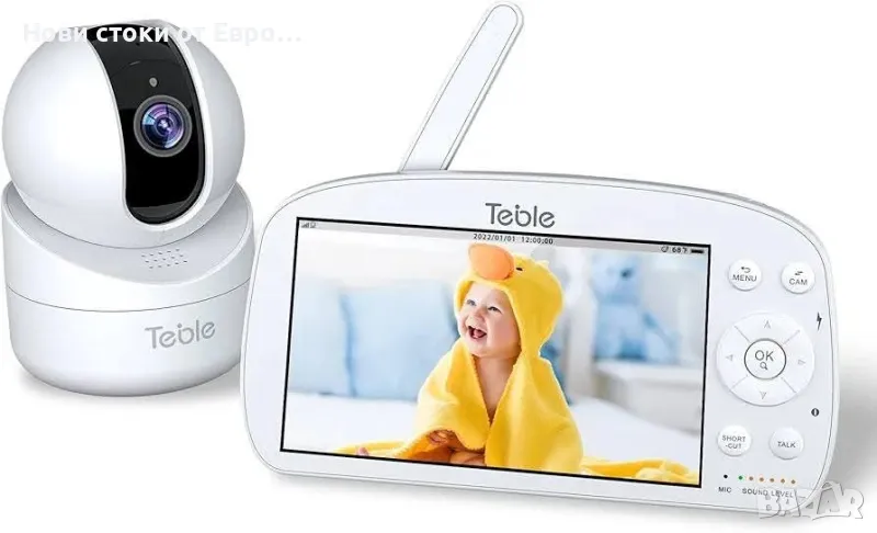 Бебефон 5,5 инча 720p HD видео бебефон, 5000mAh батерия 24 часа аудио наблюдение, нощно виждане, дистанционно панорамиране и накланяне, двупосочен разговор, VOX, температура, напомняне за хранене, 4X увеличение, 100 фута (около 304,8 метра) обхват, приспивна песенЧисто нов!Teble предоставя на всяко семейство несравнимо интелигентно изживяване в дома, което повишава сигурността, удобството и атмосферата на дома. „Технологиите опростяват живота“, това е, което ни кара да създаваме високопроизводителни интелигентни домашни продукти с отличителен дизайн, ненадмината функционалност и надеждно качество, за да направим живота по-лесен и по-добър.Освен с включения адаптер за захранване, монитора мобе да работи и с вградената си батерия и така може да го носите във всяка стая където сте без да търсите контакт за да го включите.Капацитетът на батерията от 5000 mAh осигурява на Teble Video Baby Monitor до 17 часа аудио наблюдение и 10 часа видео С 5,5-инчов HD дисплей, бебефонът предоставя по-широк изглед, пълен с богати детайли. Безпроблемно успокояване на вашето бебе, за да заспи, благодарение на вграденото откриване на звук, сладките приспивни песнички и двупосочната аудио технология. Идеален подарък за нови родители, тъй като прави родителството по-лесно и по-щастливо.5,5-инчов голям екранHD 720P IPS дисплейУдължен живот на батериятаЯсно нощно виждане2-посочно аудио5 успокояващи приспивни песниОткриване на звук и температураPan-Tilt-ZoomЕнергоспестяващ VOX режимСлед като зададете режим VOX, екранът на бебефона ще се включи без аларма веднага щом нивото на шума надвиши 65 dB.Откриване на температураБебефонът е снабден с температурен сензор, който ви предупреждава, когато температурата в стаята на бебето е по-висока или по-ниска от зададената от вас температура.Напомняне за храненеЗадайте аларма на родителското устройство, за да ви напомня, когато е време за кърмене. Устройството ви помага да се грижите за вашето бебе по-научно.Защитете поверителността сиБлагодарение на безжичната технология FHSS, връзката на видео бебефона е невероятно лична. Той е сигурен и стабилен вместо WiFi или връзки с приложения.