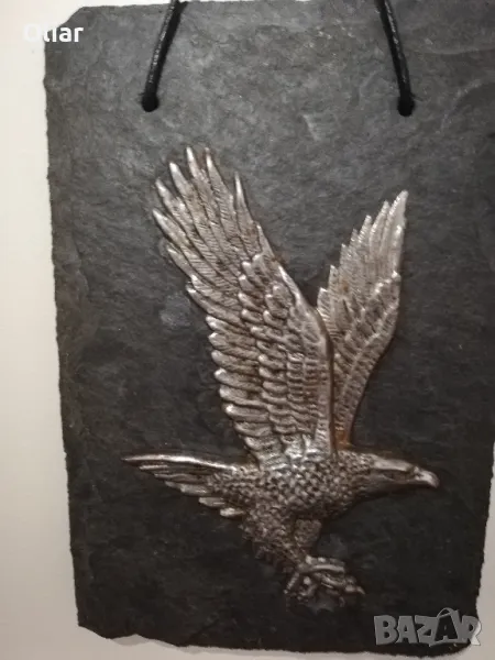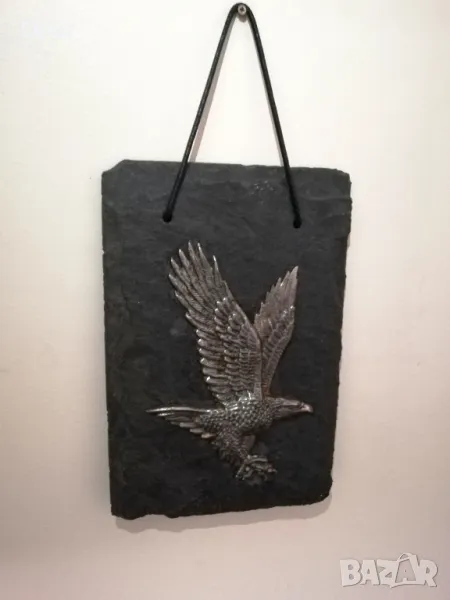 Пластика на орел върху каменна плоча. Закачалка от кожена връв. Много оригинален подарък за любител на птиците или ловец. Също така красива декорация за стена. Размери 24 на 15 см. Моля погледнете и останалите ни обяви!