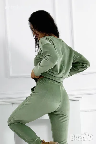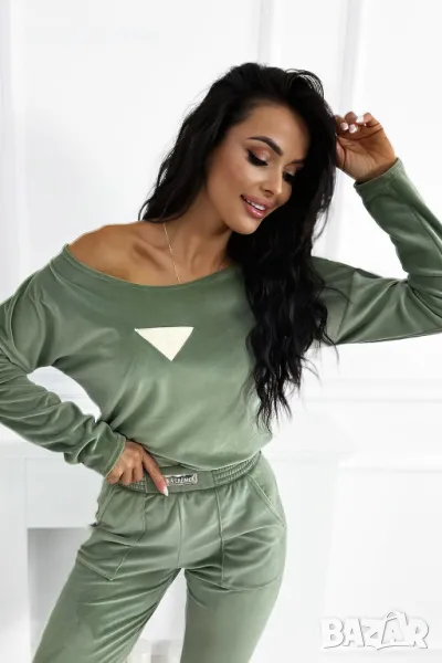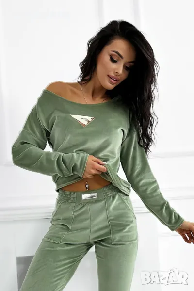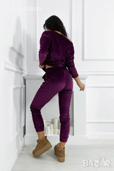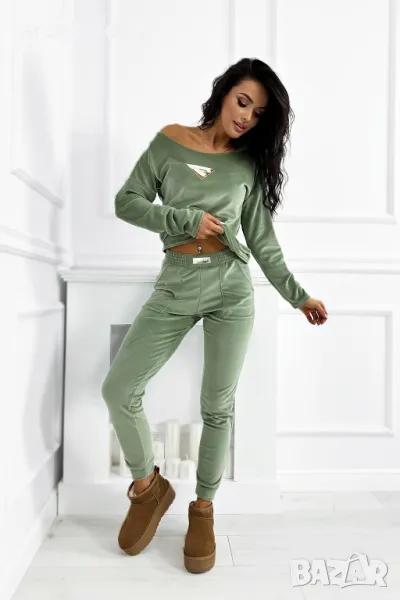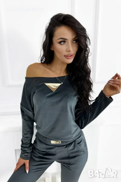 Дамски комплект от кадифе с удобни ластични панталони е идеалният избор за всеки ден. Свободна блуза, която можете да носите от рамото, съчетава стил с комфорт. Златната лепенка на суичъра и панталона придава елегантен характер на цялата визия.