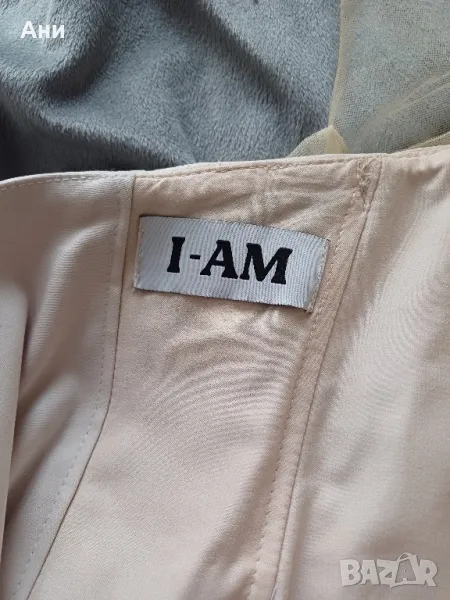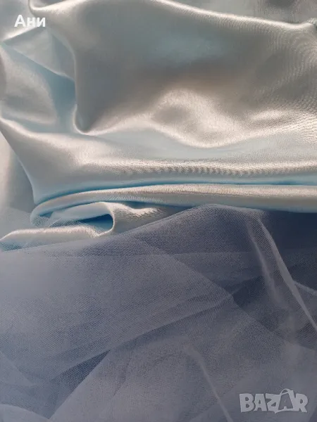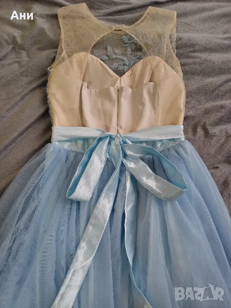 Светло синя абитуриенска рокля с дантела и сатен, марка "I am". Отзад корсета е еластичен и е с цип. По дължината на роклята има два реда воали и подплата от сатен, както и сатенена панделка. Много е лека и позволява носене без сутиен, тъй като кореса е много плътен.