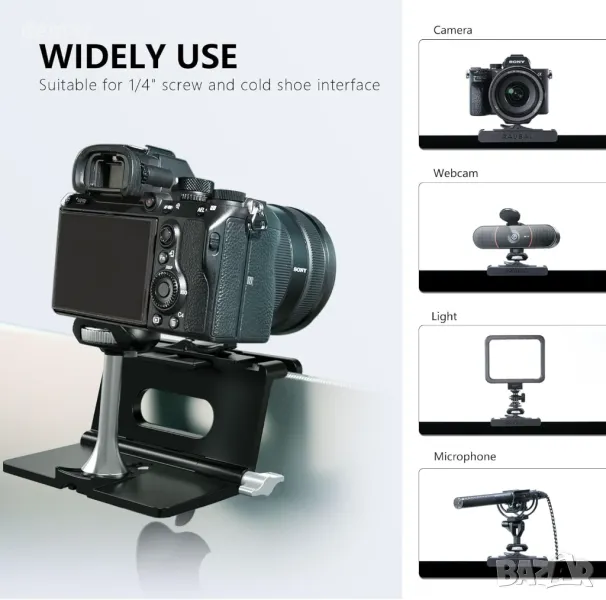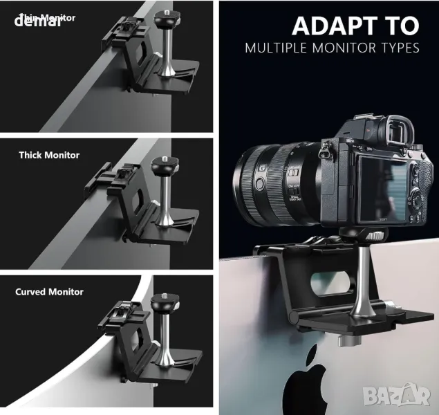 Стойката за камера на монитора разполага с подобрен дизайн на затягане за съвместимост с извити монитори с ширина до 1,4", предлагайки стабилна, регулируема настройка, която предотвратява преобръщане напред. С интерфейс с винт 1/4" поддържа различни устройства като камери, уеб камери, микрофони , и видео светлини. Компактният му дизайн спестява място на бюрото, елиминира нуждата от статив и е лесен за пренасяне и съхранение. Идеален за стрийминг на живо, видеоконференции, създаване на съдържание, онлайн преподаване и фотография.