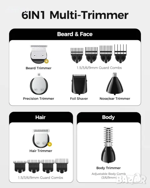 Този универсален комплект за подстригване 6 в 1 предлага шест подстригващи глави за подстригване на цялото тяло, прецизно детайлизиране, бръснене и подстригване на нос/уши. Неговите изключително остри, издръжливи остриета от неръждаема стомана осигуряват прецизни срезове и лесно почистване, докато щадящият кожата дизайн осигурява комфорт дори в чувствителни зони. Насладете се на до 150 минути безжична употреба с LED дисплей за състоянието на батерията. Комплектът включва 8 водещи гребена за персонализирана дължина на косата и брадата, плюс основни аксесоари като четка за почистване, масло за смазване и USB-C кабел, което го прави цялостно решение за всички ваши нужди за подстригване.