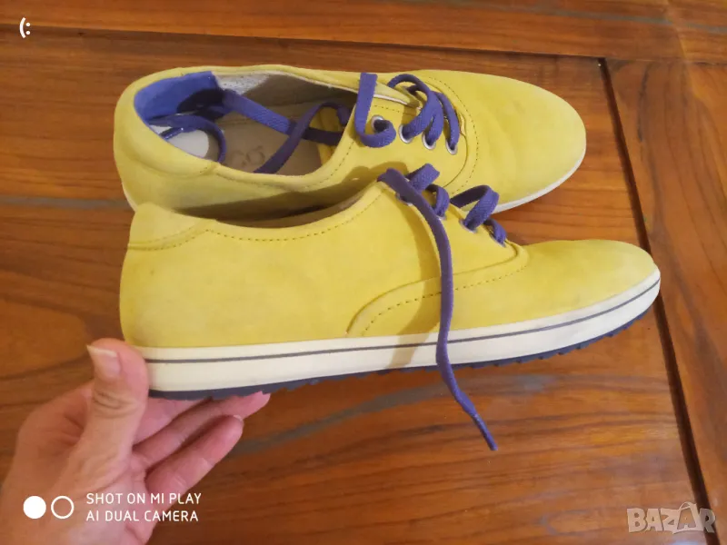 Обувките са носени с едва доловими следи от употреба са.Светло син и жълт цвят.Мека естествена кожа.Номер 38 с дължина на стелката 24,5см.Много леки и комфортни.Цена 45лв.