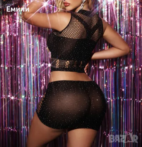 Комплект прозрачно еротично изрязано бельо мрежа с кристали XS, S, M → Обява 48838787